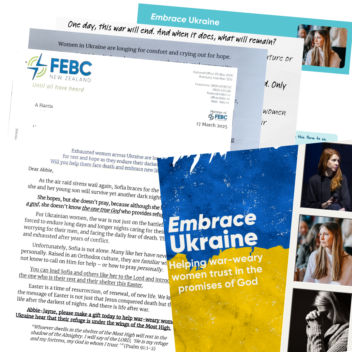 This integrated Easter appeal for FEBC was developed across print and digital channels. Centred on work in war-torn Ukraine, which strongly resonates with FEBC’s audience, the appeal focused on women’s ministry as a clear, compelling ask. Framed through the biblical hope of Easter, the letter invited donors to respond with compassion and purpose, showing how their generosity could bring encouragement, faith, and practical support to women facing immense hardship that is hard to imagine in New Zealand.